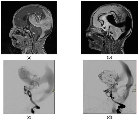 - Heuer, G.G.; Gabel, B.; Beslow, L.A.; Stiefel, M.F.; Schwartz, E.S.; Storm, P.B.; Ichord, R.N.; Hurst, R.W. Diagnosis and treatment of vein of Galen aneurysmal malformations. Child’s Nerv. Syst. 2010, 26, 879–887. [Google Scholar] [CrossRef]
