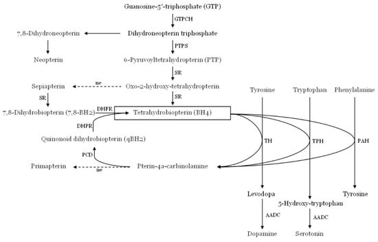 - Himmelreich, N.; Blau, N.; Thöny, B. Molecular and metabolic bases of tetrahydrobiopterin (BH4) deficiencies. Mol. Genet. Metab. 2021, 133, 123–136. [Google Scholar] [CrossRef]
