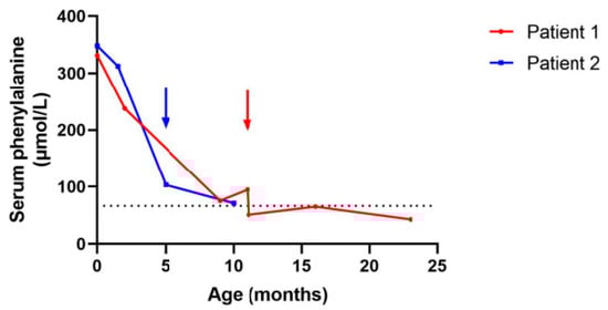 Dynamic representation of the phenylalanine levels in our patients. The dotted line represents the normal upper limit of serum phenylalanine concentrations (66.5 µmol/L). The arrows represent the start of the specific treatment (Sapropterin).
