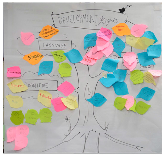 As for development rights, participants were asked to write on leaf-shaped papers what they need to have to grow and develop well, and they then had to paste it on the Development Tree under the key domains of development (physical, socio-emotional, language and communication, and cognitive development) (Figure 3).