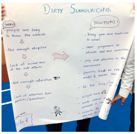 The other activity conducted was a group discussion on six (6) various themes: cleanliness, public amenities, vandalism, bullying, child participation, and child-friendly spaces. During this session, participants were divided into groups to further discuss the above issues. This included conducting the “Why Analysis” in depth based on the template given and proposed solutions, i.e., what individuals, communities, and the government can do. The activities were followed by a group presentation from the participants (Figure 5 and Figure 6).