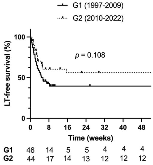 Figure 2. Kaplan–Meier native liver survival curve comparison of patients with ALF according to era. LT: liver transplant. G1: group 1. G2: group 2.