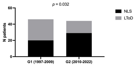 A total of 52 patients (58%) were listed for LT. Eight patients improved with medical treatment and were removed from the list (n = 6 in G2), 3 died on the waiting list (n = 1 in G2), and 41 (45%) underwent LT (median time on the waiting list was of 6 days, IQR, 2–11) (Table 2). Outcome according to aetiology is reported in Table 3. On KM analysis, the transplant-free survival was lower in G2 compared to G1, although this result did not reach statistical significance (Figure 2). Overall, the transplant rate was significantly lower in G2 (15/44, 34%) compared to G1 (26/46, 56%, p = 0.03) (Figure 3); no significant differences in the outcomes according to era and aetiology were reported (Figure 4).