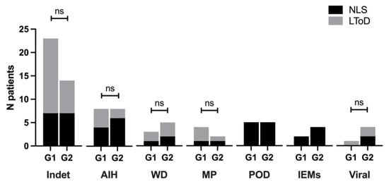 Figure 4. Comparison of the outcomes of patients with ALF according to era and aetiology. LToD: liver transplant or death on waiting list. NLS: native liver survival; G1: group 1. G2: group 2. AIH: autoimmune hepatitis; WD: Wilson disease; MP: mushroom poisoning; POD: paracetamol overdose; IEMs: inborn errors of metabolism; ns: not significant.