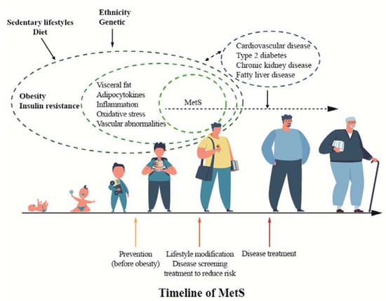 IR and obesity, particularly when associated with increased visceral adiposity, are two important elements in the pathogenesis of MetS and all related complications []. There is a higher incidence of cardiovascular morbidity and mortality in patients with obesity affected by MetS []. Increasing evidence supports the role of visceral adiposity in the etiopathogenesis of early cardiovascular risk, independent of the severity of obesity, i.e., BMI, as it is a predictor of CVD and cardiovascular mortality from childhood [].
