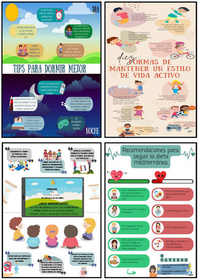 The nutritional approach will follow the MedDiet model [13]. We will not impose any caloric restriction since we aim to establish a healthy diet based on the MedDiet [14,25]. Concerning the 24-h movement behaviors, parents/guardians will be told to encourage their children to adopt an active lifestyle with a daily equilibrium of PA, sedentary behavior, and sleep that will support their healthy development [1]. Dietary and 24-h movement behavior changes in schoolchildren will be based on healthy lifestyle education for parents/guardians by infographics, video recipes, information pills, and videos. The contents of these materials have been created by the research team following international and national guidelines for PA [1,35,36], sedentary behavior [1], sleep duration [1,37], MedDiet [38], and healthy eating guidelines [39,40].