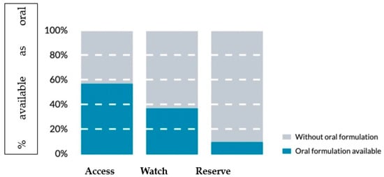 Figure 1. Percentage of oral formulations by AWaRe category (modified by [43]). - The Watch group includes a selection of antibiotic molecules that should be used for specific and limited infections either as a first or second-choice agent. Their prescription is generally the target of antimicrobial stewardship programs for their higher potential to induce AMR.
