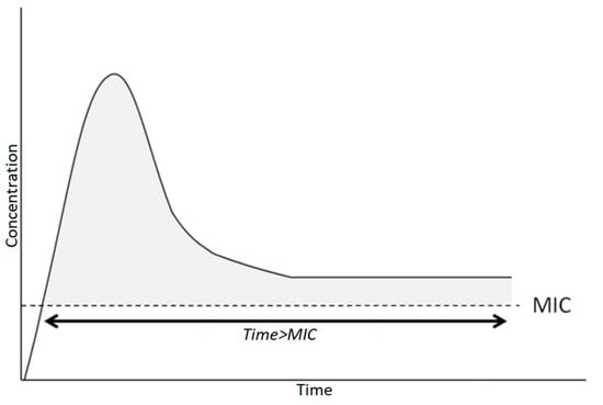 An optimal administration of time-dependent antibiotics (i.e., beta-lactam, vancomycin, clindamycin) should try to reach a stable plasma concentration above the MIC for all times of antibiotic treatment. If intravenous administration is started, the ideal schedule, currently under evaluation for many parenteral molecules (piperacillin–tazobactam, vancomycin, etc.) provides a loading dose to reach the effective concentration above the MIC, which is followed by continuous infusion to ensure T > MIC is maintained as long as possible [44,45] (Figure 2). If antibiotics are administered orally, multiple daily doses should be preferred (Figure 3): i.e., for amoxicillin, administration every 8 h is better than every 12 h [29].