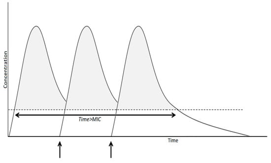 Time-dependent antimicrobial pharmacokinetic in intermittent administration. Antimicrobial efficacy is determined by the time above MIC (T > MIC) of plasmatic unbound drug concentration. Arrows shows the time of administrations.
