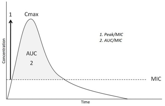 On the other hand, the effectiveness of concentration-dependent drugs is determined by the maximum concentration reached in a single point of the kinetic curve. The reference variables are the maximum concentration (Cmax) that is reached beyond the MIC (Cmax/MIC) and the area under the curve (AUC) that is above the MIC (AUC/MIC). The higher the values reached by these two variables, the greater the antibacterial effect (Figure 4).