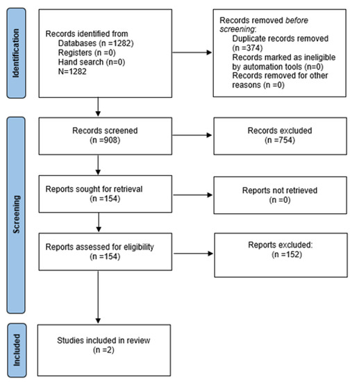 The aforementioned keyword combinations were used to search through the various databases. The search yielded a total of 1282 titles. The manual search that was conducted in gray literature did not identify any additional citations that were relevant to the search question. In total, 908 articles remained after the duplicates were taken from the list. Following this, an initial screening was carried out, after which only 154 articles were selected to go through the process of having eligibility criteria. Just 2 articles among them compared the maxillary arch width of patients with bilateral cleft lip and palate who had been treated with SME and RME. Only 2 studies were taken into consideration for inclusion in the qualitative analysis. Figure 1 presents the PRISMA flowchart.