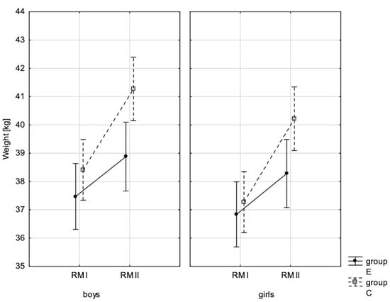 Mean values of boys’ and girls’ body weight at the beginning of the school year (RMI) and at the end of the school year (RMII) in the experimental group (E) and the control group (C). Vertical bars indicate the 95% confidence interval for the mean.