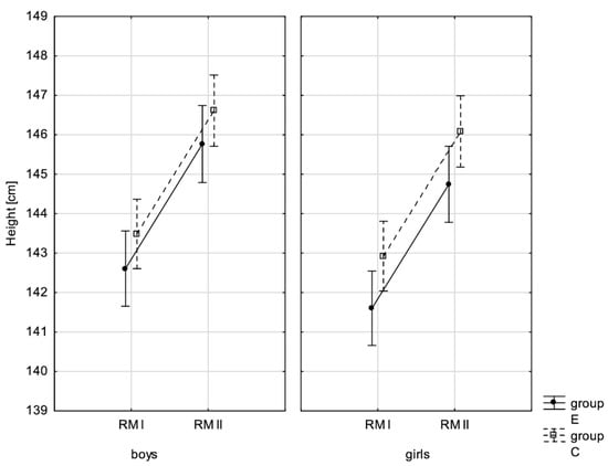 Mean values of body height for boys and girls at the beginning of the school year (RMI) and at the end of the school year (RMII) in the experimental group (E) and the control group (C). Vertical bars indicate the 95% confidence interval for the mean.