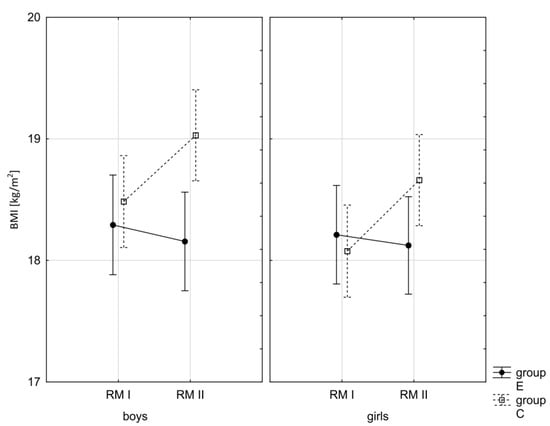Mean values of the BMI of boys and girls at the beginning of the school year (RMI) and at the end of the school year (RMII) in the experimental group (E) and the control group (C). Vertical bars indicate the 95% confidence interval for the mean.