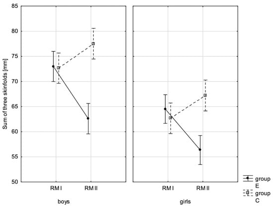 Mean values of the sum of three skinfolds of boys and girls at the beginning of the school year (RMI) and at the end of the school year (RMII) in the experimental group (E) and in the control group (C). Vertical bars indicate the 95% confidence interval for the mean.