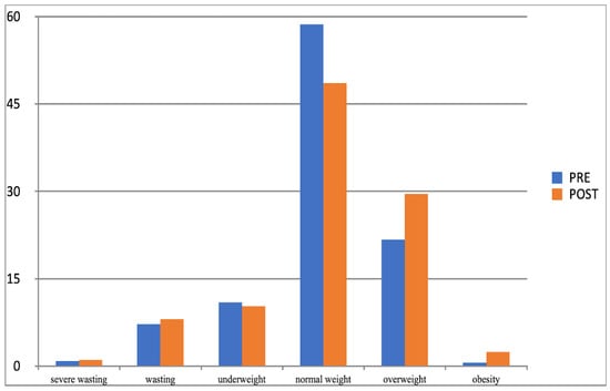 Cole and co-authors’ method was applied to assess the correctness of body mass in children [54], which proposes cut-off points relevant for age and sex to classify obesity and overweight from body mass index (BMI) international tables.