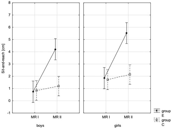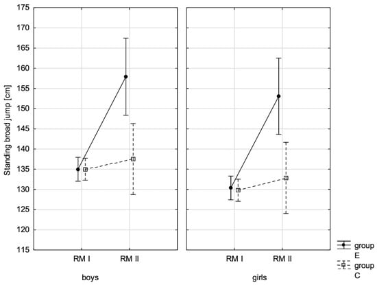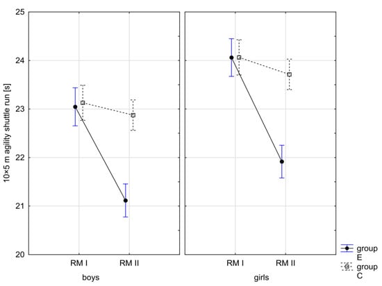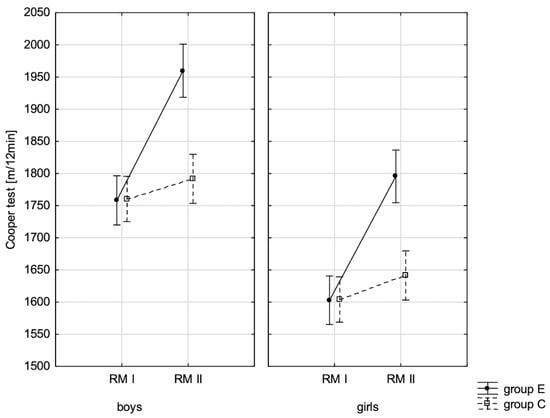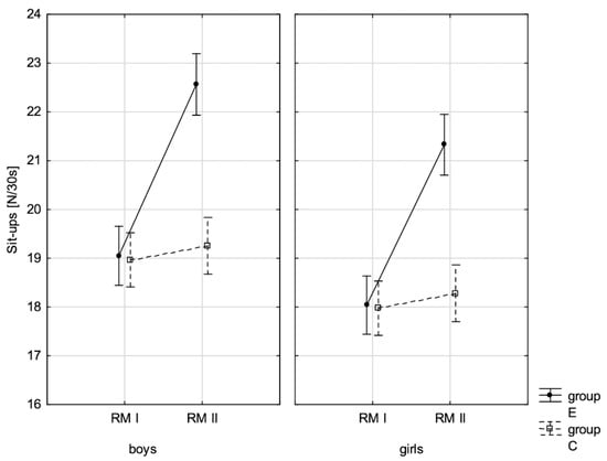 To specify what effect increased physical activity had on fitness component values, they were compared in the experimental and control groups at the beginning of the school year and after 10 months, at the end of the school year. When interpreting variance analysis data for repeated measurements, the statistically significant influence of these factors: group (E and C), repeated measurement (RM-(PRE) and (POST)), and their interaction (RM*Group), on all studied fitness variables (Table 12) was noticed.