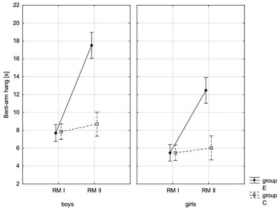 The conducted LSD test for fitness components, which juxtaposed the significance of differences among distinguished groups E-PRE, C-PRE, E-POST, and C-POST, led to the conclusion that there was noticeable variability in pairs E-PRE and E-POST and E-POST and C-POST with regard to all the analysed components, and in pair E-PRE and C-PRE only when it came to the handgrip measurement, the handgrip strength test in boys, whereas there was no significant variability in pair C-PRE and C-POST with regard to the distance jump test (the standing broad jump) and the functional strength test (bent-arm hang) in boys and girls. It can be therefore stated that the experimental group and control group varied at the beginning of the school year only in terms of the value of handgrip strength measurement in boys. After 10 months, the values of all the tested fitness components substantially increased in the experimental group, while no noticeable changes in the scoring of the long jump and bent-arm hang were observed in the control group.