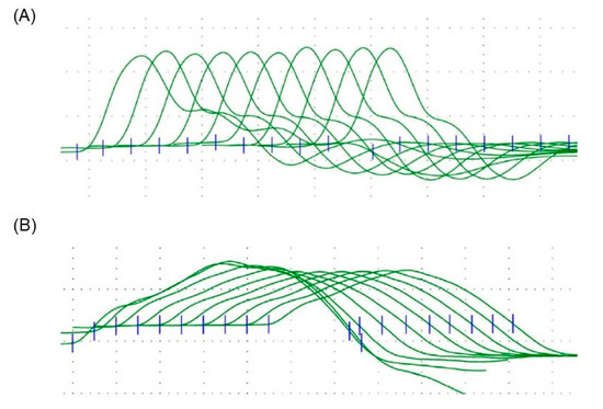 Repetitive nerve stimulation studies with 5 Hz frequencies in the accessory and median nerves. Blue lines indicated the start point of each wave. (A) Median nerve study showed no decremental response. (B) Accessory nerve showed a decremental response of 28.8%.