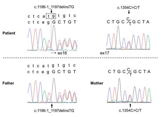 Next-generation sequencing of the patient’s genomic DNA revealed two heterozygous mutations in the COLQ gene: a heterozygous mutation at the splice site c.1196-1_1197delinsTG and a heterozygous missense mutation c.1354C>T. Genetic testing of her parents showed that the former mutation was present in the father, and the latter mutation was present in the mother. Thus, based on these pathogenic mutations, it was considered a compound heterozygous mutation. The c.1354C>T mutation has been previously reported in affected patients [8]. To understand the clinical significance of the splice site mutation, RNA was isolated from peripheral blood leukocytes, and mRNA analysis was performed. Analysis revealed a product with exon 16 skipped, and the mutation was considered to be pathogenic (Figure 3). Depending on the guideline for sequence variants in the American College of Medical Genetics, the variant c.1196-1_1197delinsTG (p.Arg399delins = fs * 17) was satisfied with the categories PVS1 and PM2, which are categorized as class 4 (likely pathogenic). The variant c.1354C>T (p.Arg452Cys) was satisfied with PS1, PM2, PP3, and PP4, which were also categorized as class 4 (likely pathogenic).