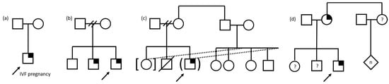 Pedigree examples of family structures influencing family experiences of pediatric genomic sequencing. Child with suspected genetic condition denoted by arrow. Square denotes male, circle denotes female, diamond denotes unknown sex/gender, n denotes multiple and/or unknown number. Symptomatic individual with identified gene variant denoted by quarter shading. (a) Only child, conceived through in vitro fertilization (IVF). (b) Family structure with separated parents, three sons, the youngest of whom are similarly affected. Two slashes denote separation of relationship. (c) Family structure involving foster and adoption of biologically related children resulting in a blended foster/biological family. Dotted lines denote adoption/foster relationship, brackets denote adoption, parentheses denote foster relationship, and slash denotes deceased. Two slashes denote separation of relationship. (d) Family structure in which the parent is also affected and the status of the child’s siblings and the parent’s sibling and children is unknown, denoted by question mark.