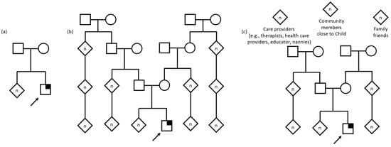 Pedigree examples of family as described by interview participants. Child with suspected genetic condition denoted by arrow. Square denotes male, circle denotes female, diamond denotes unknown sex/gender, n denotes multiple and/or unknown number. Symptomatic individual with identified gene variant denoted by quarter shading. (a) Nuclear family defined as a unit limited to parents and children. (b) Extended family including multiple generations including grandparents, cousins, great grandparents, second cousins, and others. (c) A family defined as anyone who helps take care of or is close to the child, including formal and informal care providers, community members, family friends, and the child’s extended family.