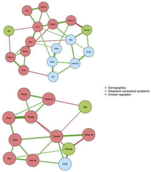 - Cervin, M.; Perrin, S.; Olsson, E.; Aspvall, K.; Geller, D.A.; Wilhelm, S.; McGuire, J.; Lázaro, L.; Martínez-González, A.E.; Barcaccia, B.; et al. The Centrality of Doubting and Checking in the Network Structure of Obsessive-Compulsive Symptom Dimensions in Youth. J. Am. Acad. Child Adolesc. Psychiatry 2020, 59, 880–889. [Google Scholar] [CrossRef]