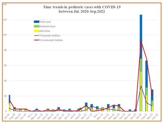 The monthly COVID-19-associated number of hospitalizations in children and adolescents during the week ending July 2022 was nearly five times (20 vs. 125) the number during the week ending July 2020. Hospitalizations for both vaccinated and unvaccinated children during July 2022–September 2022 for the mild and moderate forms among children aged 0–18 years was nearly 5.23 times compared with a similar period in 2020 (47 vs. 246) and 10 times higher for 2021 (See Figure 1).