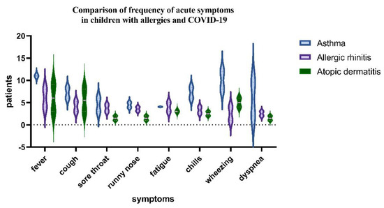 In the group of 250 pediatric patients with a positive history of allergies, the following was finally diagnosed: 11 (4.4%) had allergic rhinitis and 11 were found with atopic dermatitis. Eighteen pediatric patients (7.2%) had asthma. We found patients with two comorbidities in 14.8% of cases and 16% with one comorbidity. The most common allergens were weeds pollens (Artemisia and Ambrosia), grass pollen, house dust and flour dust mites, tree pollen, cat and dog allergens, Dermatophagoides pteronyssinus, and Dermatophagoides farinae. There was a correlation between the proportion of diagnoses of asthma and allergic rhinitis and RDV administration. The performed statistical analysis allowed us to observe that patients with allergies and COVID-19 have symptoms such as fever, wheezing, and dyspnea and that these were statistically significant for asthmatic patients. The main symptoms related to asthma-associated COVID-19 are shown in Figure 3.