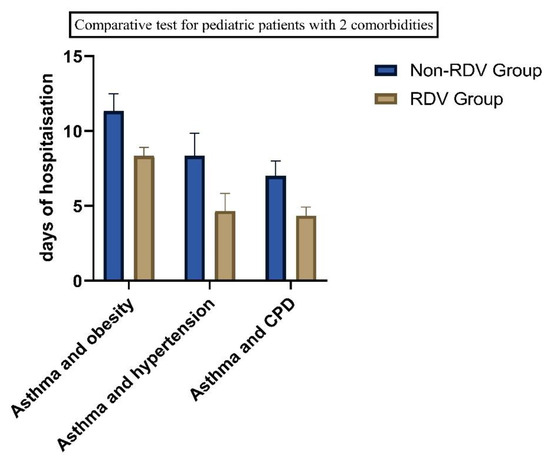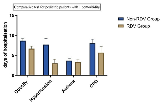 We found significant differences between the patients with comorbidities. Sixteen patients presented with asthma and obesity, (BMI > 30 kg/m2), 13 patients were diagnosed with asthma and hypertension, and eight have asthma and chronic pulmonary disease (See Table 1). Twenty-three patients with one comorbidity received RDV and 25 (19.84%) with two comorbidities were included in the RDV group. Of the 42 children with allergies, 43% had at least one comorbidity condition and 23% had two comorbidities. 27.7% had preexisting chronic pulmonary disease and 21.43% had obesity. Comorbidities were independently associated with increased days of hospitalizations (See Figure 4 and Figure 5).