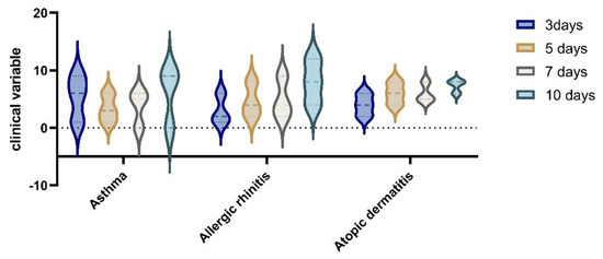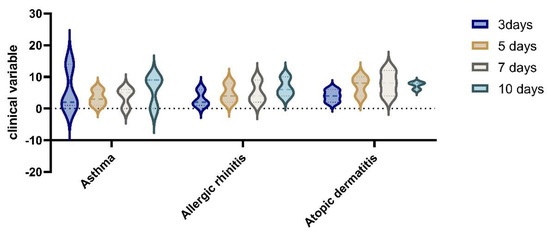 Clinical improvements after RDV administration in the allergies group with asthma, allergic rhinitis, and atopic dermatitis at 3, 5, 7, and 10 days after hospitalization.