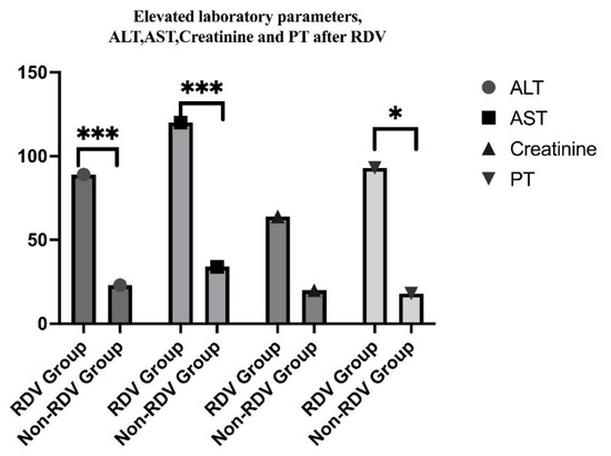 The adverse effects, such as increased liver enzymes, occurred in 68 patients who have elevated ALT levels and 78 for AST, in the RDV group vs. 21 and 32 in the non-RDV group, p = 0.032 and 0.001) (See Figure 8). Overall, our patients experienced mild adverse reactions to RDV, (grades 1 and 2), which did not lead to discontinuation. No allergic reactions were attributed to RDV in pediatric patients included in this study. Laboratory safety findings also included creatinine increased level, which was higher in the non-RDV group without statistical significance.