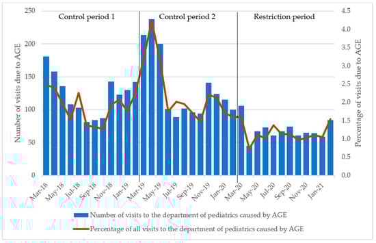 The percentage of AGE-related visits to the department of paediatrics also showed a statistically significant decline after SARS-CoV-2 restrictions were introduced (2.1% during the control period vs. 1.1% during the SARS-CoV-2 restrictions), suggesting that the decline in AGE-related visits cannot be explained by fewer visits to the department of paediatrics in general.