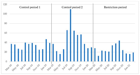 Number of positive stool samples per month. Control period 1 refers to March 2018 through February 2019, control period 2 refers to March 2019 through February 2020 and the restriction period refers to March 2020 through February 2021.