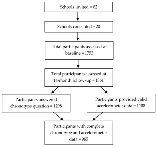 Because low physical activity, high sedentary time, and insufficient sleep (<8 h) in adolescents are associated with poor health outcomes [11] and worse school performance [12], exploring the differences in these potentially modifiable behaviours across chronotypes might help to inform future lifestyle interventions. Therefore, the aim of this study was (1) to describe accelerometer-assessed physical behaviours by chronotype and (2) to examine the association between chronotype and physical behaviours in a cohort of adolescent girls.