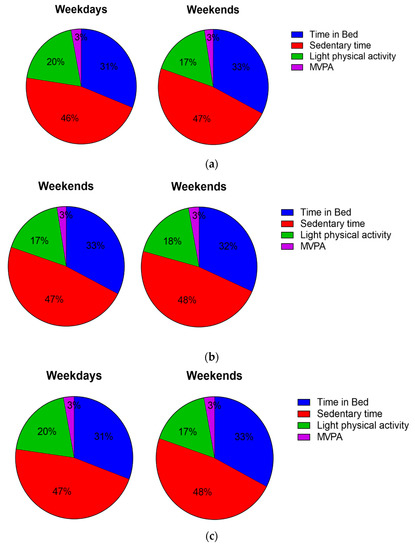 In the present study, participants spent the majority of their time in sedentary activities (46%), one-third (31%) in ‘time in bed’, and only a small proportion of the day in light activity (20%) and moderate-to-vigorous activity (3%). The proportion spent in each behaviour was similar across weekdays and weekends and across chronotypes. Very similar proportions for the 24 h activity profile assessed using accelerometers were found in a sample of 119 adolescent females across New Zealand [28]. However, it should be highlighted, that the participants in the sample from New Zealand were slightly older (16.8 vs. 13.9 years) and different accelerometer placement (worn on the waist) and processing methods were used. Studies that used wrist-worn accelerometers and processing methods such as in the present study have reported comparable times spent in different activities in girls of a similar age. For instance, both Sanders et al. [29] and Fairclough et al. [30] reported approximately 46 min per day of moderate-to-vigorous physical activity. Fairclough et al. [30] also reported similar durations for sleep (7 h), light activity (~270 min), and sedentary behaviours (~620 min) compared to the findings from the present study. Current 24 h movement guidelines for children and adolescents aged 5–17 recommend at least 60 min of moderate-to-vigorous physical activity, less than two hours of sedentary screen time, and 8–10 h of sleep for adolescents aged 13–18 each day [23,24]. In the present study, only 16% and 22% met the recommended guidelines for moderate-to-vigorous physical activity and sleep, respectively. Therefore, it is important to understand the 24 h activity profile for future interventions.