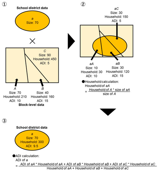 Here, “sd” indicates the school district and “H” indicates the number of households. Figure 2 shows a sample calculation of the ADI for each school district.