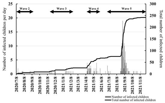 Four COVID-19 waves occurred in Japan during the survey period (Waves 2–5; Figure 3). Therefore, the number of infected children categorized by wave (Wave 2: 8 July 2020 to 17 September 2020; Wave 3: 15 November 2020 to 16 February 2021; Wave 4: 12 April 2021 to 3 June 2021; and Wave 5: 24 June 2021 to 10 November 2021) were also analyzed. Figure 3 shows the changes in the number of infected children per day and the total number of infected children in all target schools.