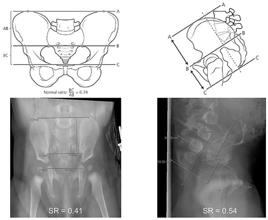 - Ahmad, H.; Halleran, D.R.; Stanek, J.R.; Thompson, B.P.; Bates, D.G.; Rusin, J.A.; Minneci, P.C.; Levitt, M.A.; Wood, R.J. Correlation between the Lateral and Anteroposterior Sacral Ratios in Anorectal Malformations. Pediatr. Radiol. 2021, 51, 1867–1872. [Google Scholar] [CrossRef]