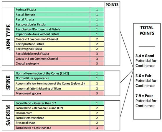 - Minneci, P.C.; Kabre, R.S.; Mak, G.Z.; Halleran, D.R.; Cooper, J.N.; Afrazi, A.; Calkins, C.M.; Corkum, K.; Downard, C.D.; Ehrlich, P.; et al. Can Fecal Continence Be Predicted in Patients Born with Anorectal Malformations? J. Pediatr. Surg. 2019, 54, 1159–1163. [Google Scholar] [CrossRef]