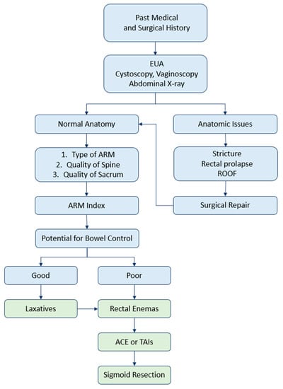 - Baxter, K.J.; Garza, J.M.; Rollins, M.D.; Drake, K.; Reeder, R.W.; Wood, R.; Avansino, J.; Calkins, C.M.; Ralls, M.; Garvey, E.M.; et al. Multi-Institutional Review of Bowel Management Strategies in Children with Anorectal Malformations. J. Pediatr. Surg. 2020, 55, 2752–2757. [Google Scholar] [CrossRef]