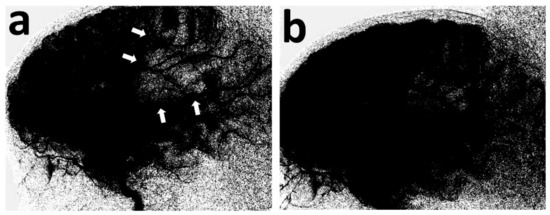 Lateral view of the digital parenchymography, before and after thrombectomy. At baseline, it demonstrates the lack of opacification of the MCA (md) territory (a) (white arrows), which materially opacifies, following removal of the retriever (b).