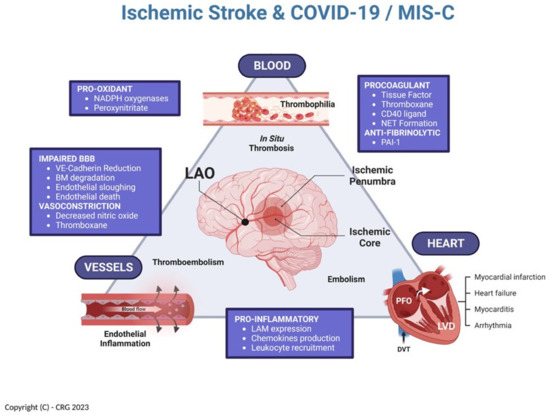 As with any other analysis of ischemic stroke, we have historically considered three pathologic domains that interact as precursors for the development of acute cerebral arterial embolism: cerebrovascular (i.e., “vessels”), cardiac (i.e., “heart”), and hematologic (i.e., “blood”). These domains, operating interdependently, constitute a construct that can be greatly affected by the numerous derangements of endothelial function identified in patients with COVID-19 and MIS-C [7]. As such, endothelial inflammatory changes directly affecting the cerebral arteries become the pathologic substrate of the arteritis previously identified in these children, and which can be readily imaged using MRI-based vessel wall imaging techniques [9,18,19]. In addition, direct procoagulant abnormalities of endothelial function, as well as primary thrombophilias, are bound to add to the problem by promoting intravascular in situ thrombosis [21,22]. Such development of intravascular thrombi may directly occlude a cerebral artery, or else create a nidus for embolism. The latter could easily occur within the left ventricle of a failing heart affected by myocarditis (i.e., “cardiogenic” embolism), or even in the deep venous system of the pelvis from where it can travel, via naturally existing right-to-left shunts, to the cerebral circulation (i.e., “paradoxical” embolism via a patent foramen ovale).