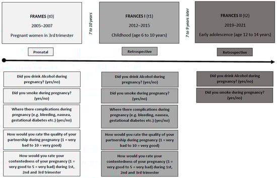 Study aims: The aim of this longitudinal prospective cohort study, with three points of data collection, was to validate women’s subjective self-reports regarding hard-risk pregnancy factors, such as substance use (alcohol, smoking). In addition, self-reports of emotional soft-risk pregnancy characteristics, such as psychosocial parameters, were evaluated. To date, their assessment is not generally standardized, and therefore, pregnancy risks are difficult to detect, resulting in a low number of studies addressing this concern. Current literature addresses maternal recall validity predominantly via single- or two-point data collection and comparison to mostly objective birth data collection in the perinatal examination, postnatal visits or national databases [19,38]. We intended to review the gap in evaluating subjective parental interviews as an integral element of anamnesis. We also aimed to detect potential changes in mothers’ self-report during their children’s development and discuss possible age-specific contributing factors.