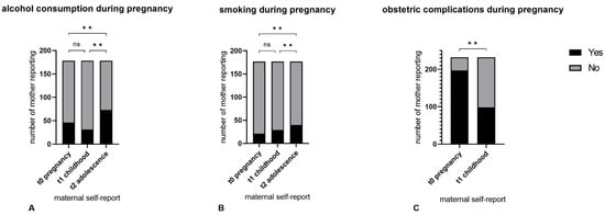 The t0–t1–t2 self-report data on alcohol (A), smoking (B) and obstetric complications (C) during pregnancy. ** p < 0.01, ns: not significant.