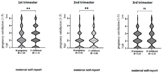The t0–t1 self-report data for pregnancy satisfaction. Rating of pregnancy satisfaction via Linkert-Scale analogous to German school grades 1 = very good to 5 = very bad: ** p < 0.01, ns: not significant, M: mean.