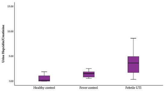 The urinary hepcidin–creatinine ratio was significantly different between the healthy, febrile control, and febrile UTI groups (p = 0.001). An increasing trend was observed from healthy to febrile UTI groups (Figure 2).