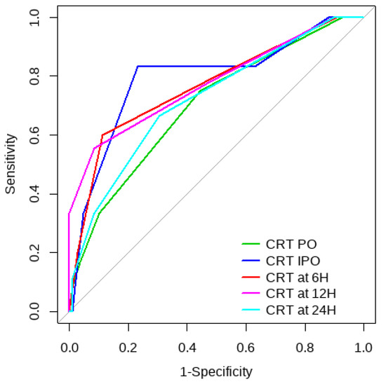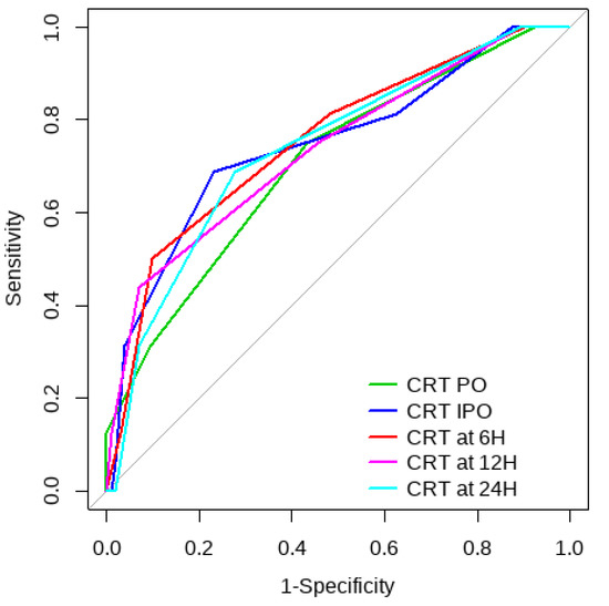 Even though the SL AUC showed a better discriminative capacity for both outcomes, the multivariate analysis suggests that the CRT has a better independent predictive capacity at IPO and 12 h, which has also been reported in some studies [5,12]. Likewise, in adult patients with septic shock, CRT-guided treatment has been shown to be non-inferior to serum lactate-guided treatment [13].