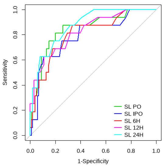 Overall, SL obtained a higher area under the curve (AUC) than CRT for both outcomes (Figure 1, Figure 2, Figure 3 and Figure 4). The AUC of CRT for mortality and ECMO ranged between 0.7 and 0.8 in all measurement times. The COP varied between 3 and 4 s. SL maintained an AUC between 0.85 and 0.95 for mortality in all measurement times and the COP ranged between 1.5 and 3.2 mmol/L. For the ECMO requirement, the AUC ranged between 0.79 and 0.9, obtaining COP from 1.7 to 5 mmol/L (Table 6 and Table 7).