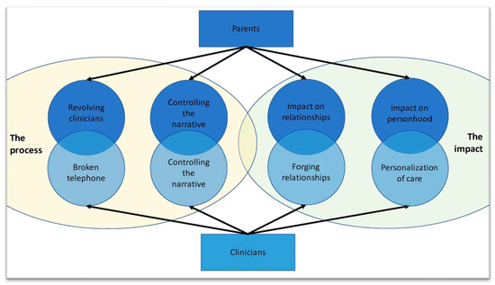 Venn diagrams visually depicting the relationship between two overarching themes and their subthemes. It highlights the parallels and overlapping experiences of the families with those of the clinicians.